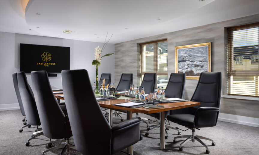 The Boardroom is the most prestigious meeting room in the hotel. The fixed walnut boardroom table can seat up to 12 people. A large wall-mounted 75′ television screen provides a clear focal point for presentations or Hybrid Events. The Boardroom has the latest technology in audio-visual conferencing to ensure the most up-to-date approach to conferencing in the modern post-pandemic world.